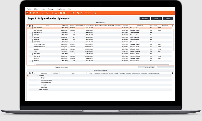 - Gestion comptabilité et finances : vous gérez l’intégralité de vos démarches comptables (règlements et relances, trésorerie, déclaration de la TVA, etc.). Vous accédez à des facilités de saisie et créez des automatismes pour gagner en efficacité.