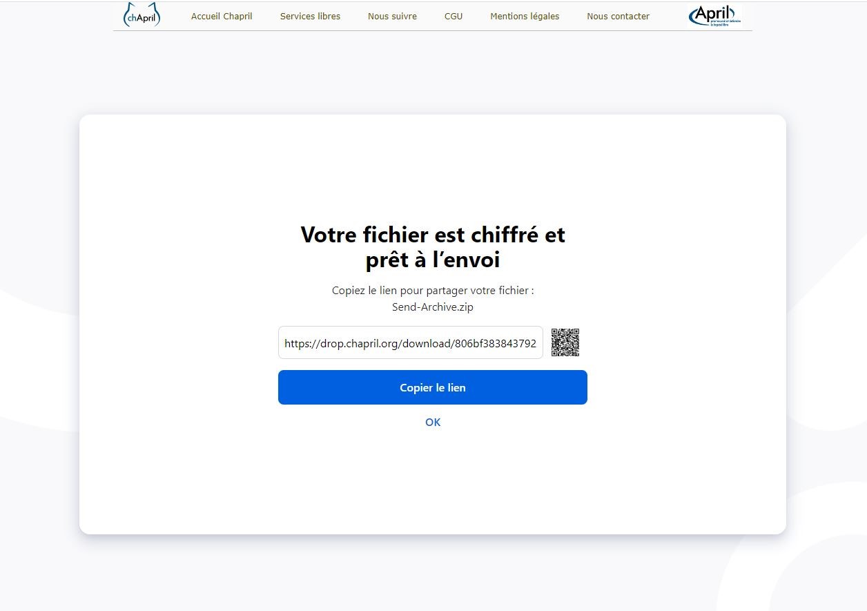 Lorsque votre ou vos fichier(s) sont chargés, DropChaprilOrg délivre un lien à partager au(x) destinataire(s). Les fichiers étant chiffrés, la confidentialité des données est assurée.