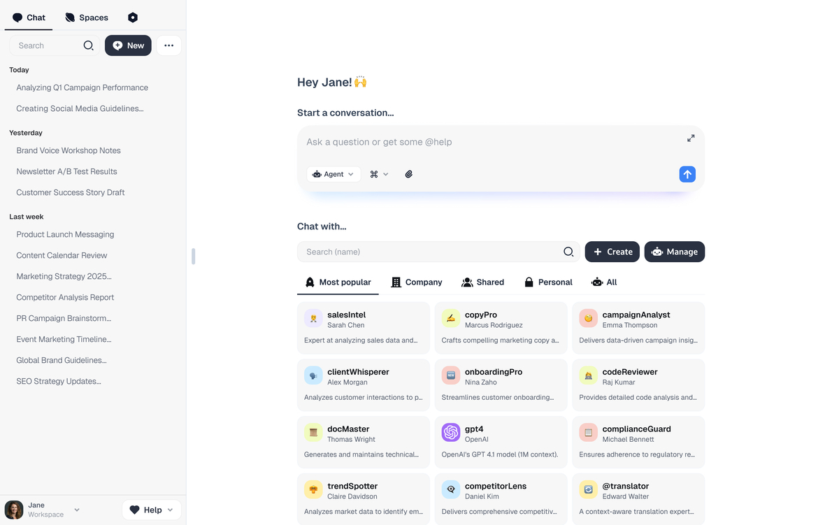 - Partage et collaboration : les agents créés peuvent être partagés avec l’équipe, avec un système de retours pour itérer sur leur configuration.