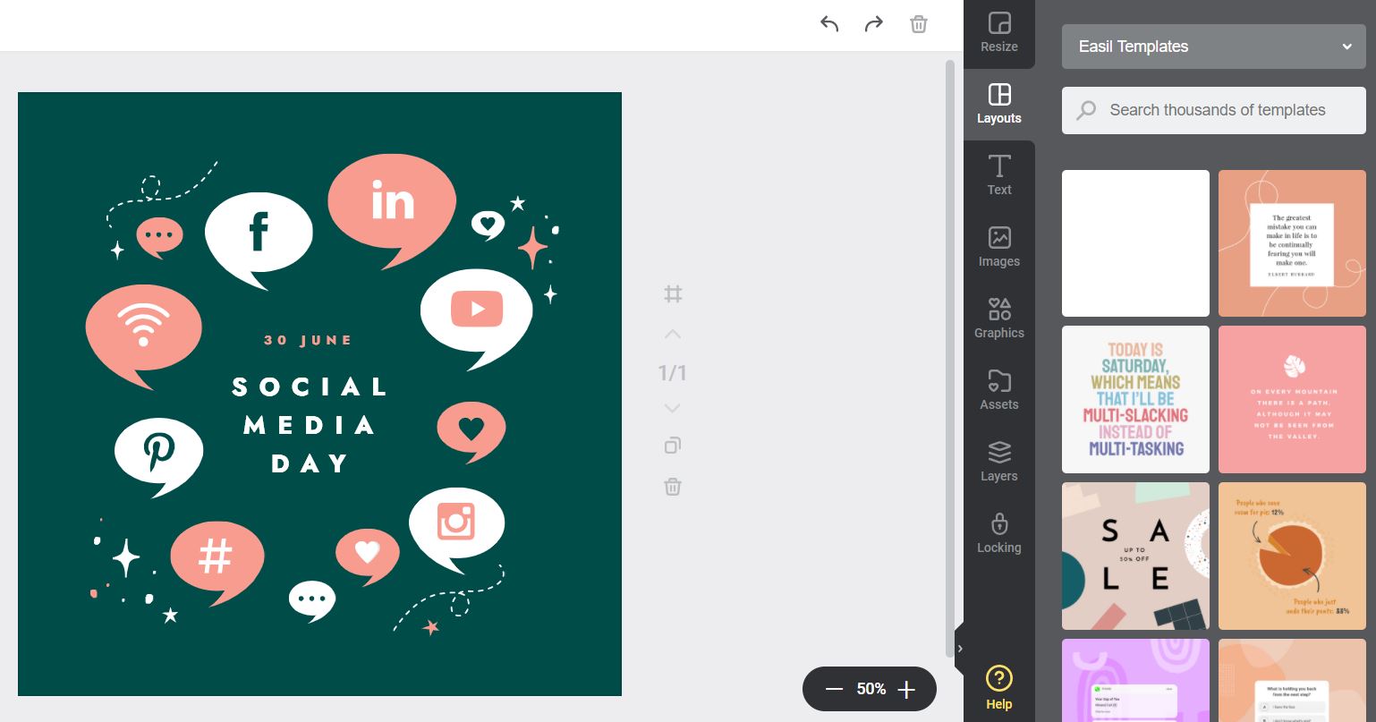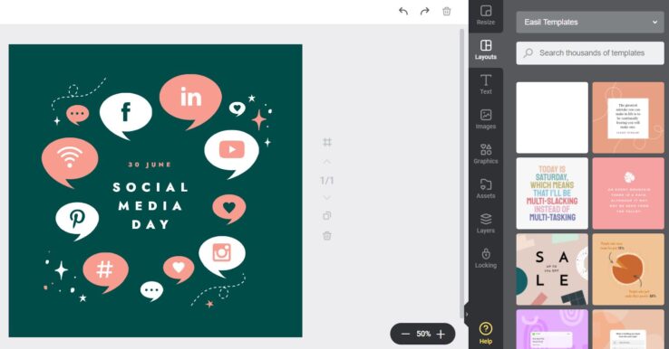 Easil est un outil pour créer des visuels pour tous les médias sociaux. Il dispose de nombreux templates sous les formats les plus courants : post, story, couverture ou bannière des réseaux sociaux suivants : Facebook, Instagram, YouTube, Twitter, LinkedIn et Pinterest.