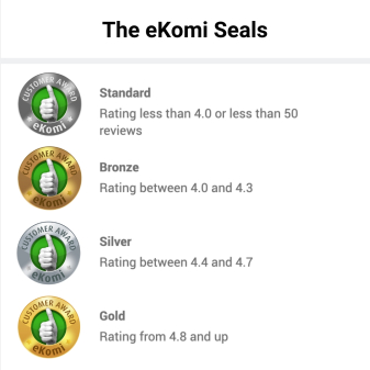 eKomi est un acteur indépendant connu sur le marché des solutions d’avis clients. Son logo rond est visible sur de nombreux sites e-commerce et très reconnaissable. Le logo change de couleur en fonction de la note : gris, or, argent ou bronze.