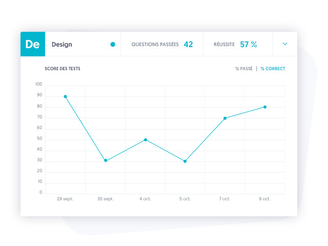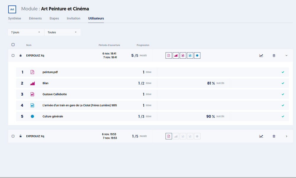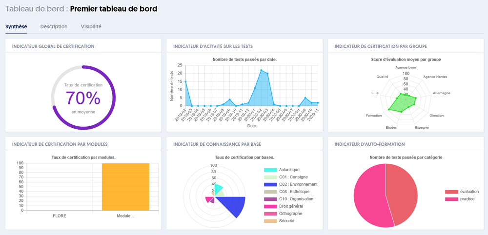 - Résultats : ceux-ci sont livrés avec une vue synthétique et une vue détaillée par collaborateur et par question. Des informations sont communiquées sur le score, le taux de réussite, le temps de réponse à chaque question ou encore sur la réponse donnée.