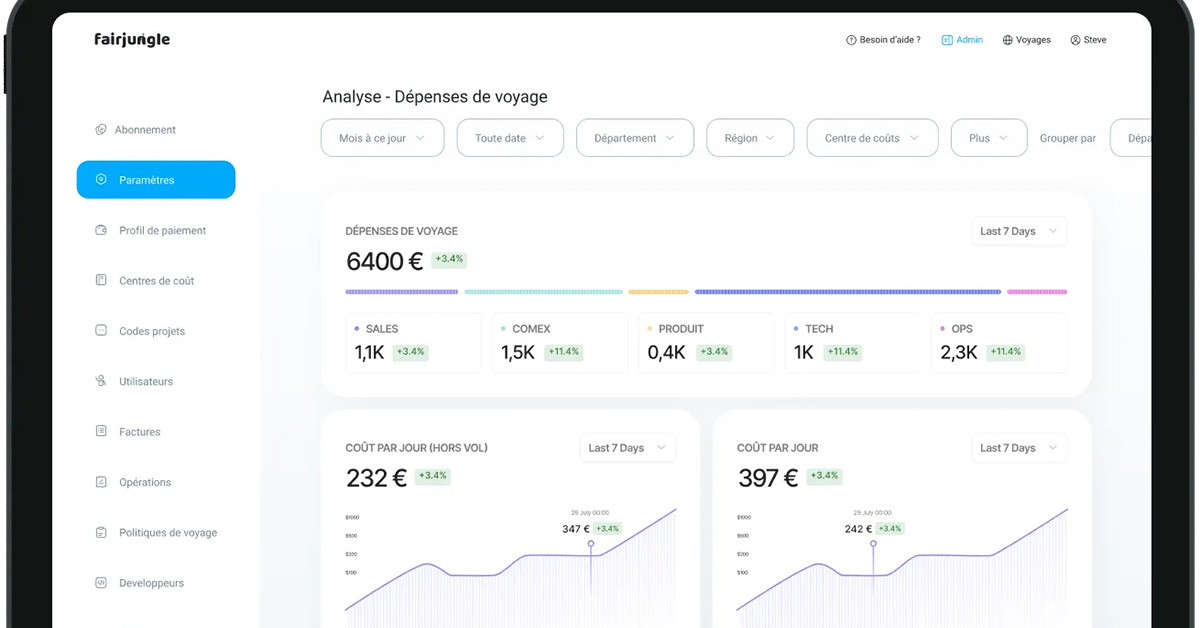 - Gestion des voyages d’affaires : Fairjungle vous aide à identifier les voyages non essentiels avec une politique améliorée par l’IA et des processus de validation personnalisables. Il est également possible de centraliser les différentes factures ou de les récupérer avec l’API de la plateforme.