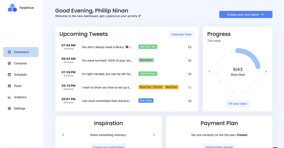 - Planification : FeedHive permet de programmer ses contenus en utilisant l’IA pour déterminer les moments à fort potentiel d’audience.