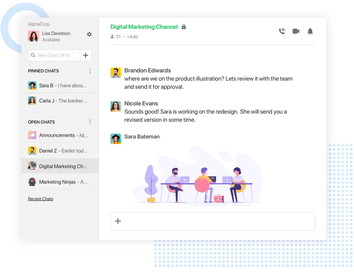 - Options de communication : Flock vous permet de choisir le moyen de communication le plus adapté à vos besoins : messagerie, appels vidéo ou audio, messages vocaux, etc. Les discussions sont organisées sous la forme de canaux (en discussion privée ou de groupe), avec l’historique des conversations précédentes. Vous avez aussi la possibilité d’envoyer des fichiers (images, vidéos, PDF, fichiers divers…).