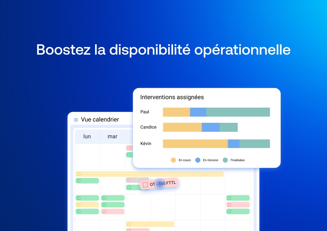 La solution gère l’intégralité du cycle d’intervention, depuis la création des ordres de travail jusqu’à leur finalisation. Des techniciens peuvent être affectés à chaque opération de maintenance, avec un suivi de progression en direct. Les demandes peuvent provenir de plusieurs canaux et sont automatiquement hiérarchisées selon leur niveau d’urgence.