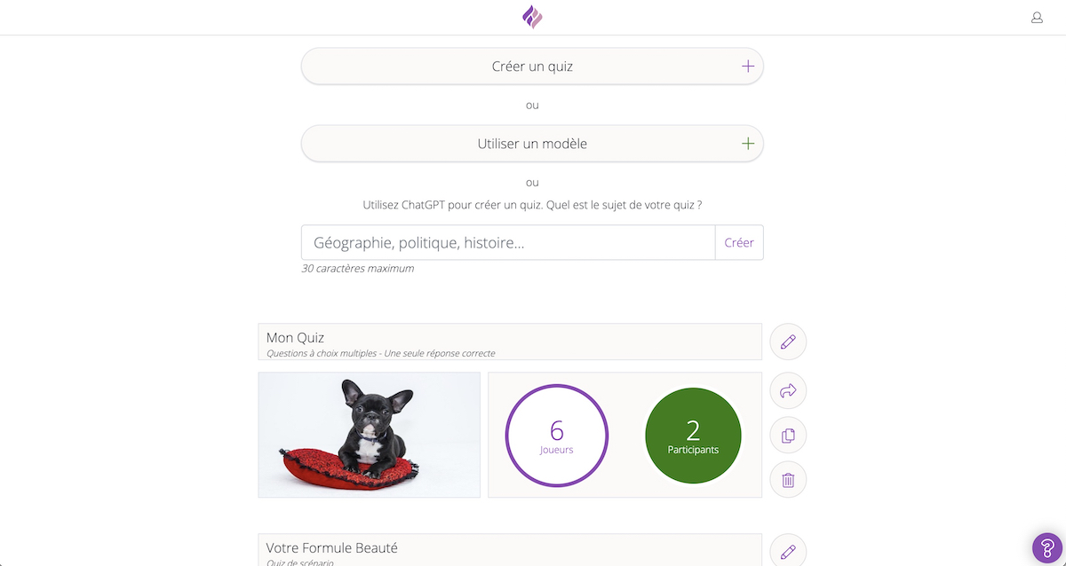 - 20 € par mois : pour un nombre illimité de participants, avec l’intégration de Zapier, des quiz en marque blanche, avec l’ajout d’images, ou encore l’accès aux statistiques.