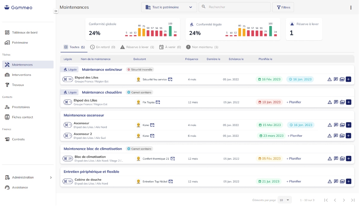 Gammeo est une solution de GMAO conçue pour cartographier vos infrastructures et piloter vos opérations de maintenance. La plateforme vise à simplifier et à fluidifier la prise de décision dans la gestion des bâtiments, couvrant les obligations réglementaires, la gestion des prestataires ou encore l’organisation des travaux. Le logiciel est adapté aux entreprises de tous les secteurs : santé, enseignement, hébergement, restauration, retail, etc. Il est accessible via un navigateur ou son application mobile.