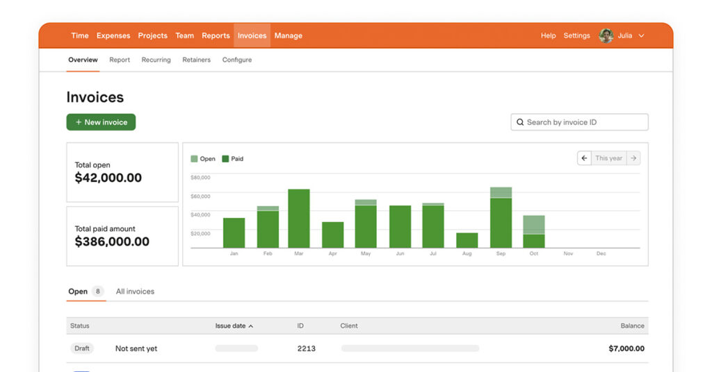 - Gestion de la facturation : le logiciel permet de créer automatiquement des factures à partir du temps et des dépenses suivis.