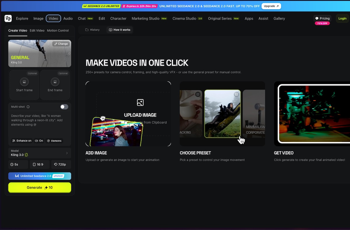 - Génération de vidéo : L’outil donne accès à une large bibliothèque de modèles (Kling 3.0, Seedance 2.0, Sora 2, Veo 3.1, WAN 2.6…) depuis une interface unifiée, avec des préréglages cinématographiques et des effets visuels prédéfinis.