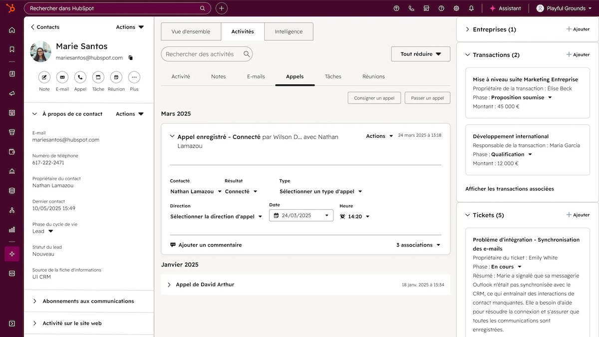Toujours dans une logique de rétention, HubSpot Service Hub offre la possibilité de créer des enquêtes de satisfaction personnalisables (NPS, CSAT, CES, etc.) pouvant être envoyées à différentes étapes du parcours pour mesurer l’expérience client. Pour coacher les équipes support, l’outil embarque aussi un outil d’intelligence conversationnelle, qui enregistre et transcrit automatiquement les appels dans le CRM. Il donne aux managers la matière pour détecter les points de friction, repérer les meilleures pratiques et laisser des feedbacks ciblés sur des moments précis d’un appel.