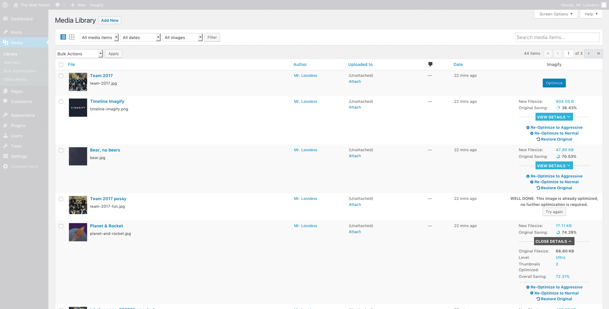 Afin d’optimiser la performance web des sites internet, Imagify propose trois degrés de compression : Normal, Agressif, Ultra. La compression Normal permet de réduire le poids d’une image sans perte de qualité tandis que les deux autres permettent de compresser les fichiers de manière drastique, avec une qualité d’image légèrement amoindrie. C’est donc à l’utilisateur de trouver le juste équilibre entre la perte de qualité (pas toujours visible) et la compression souhaitée afin de conserver des visuels attractifs.