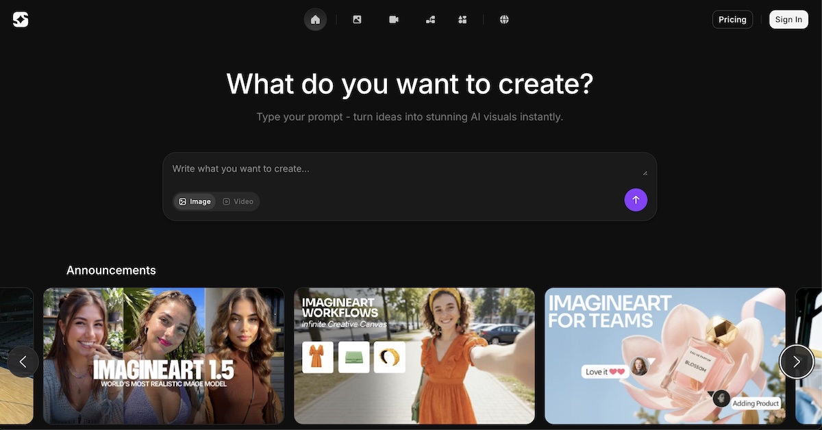 ImagineArt est une plateforme de création assistée par intelligence artificielle qui permet de générer des contenus visuels, audio et vidéo à partir de simples instructions textuelles. Destinée aux designers, créateurs de contenu, marketeurs ou toute personne souhaitant produire des visuels sans maîtrise technique poussée, elle offre un ensemble d’outils multimédias intégrés, accessibles depuis un navigateur ou une application mobile.