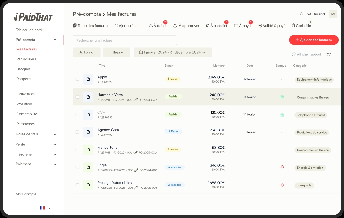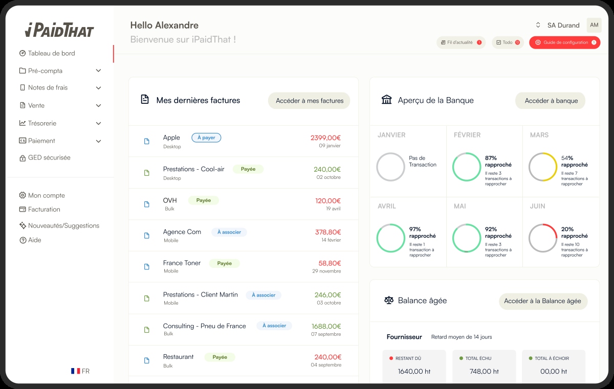 iPaidThat est une solution de facturation et de gestion comptable conçue pour les TPE et PME. L’outil centralise les documents, récupère les pièces comptables et facilite le suivi des flux bancaires, afin de rendre la gestion plus structurée au quotidien. La solution est accessible depuis un navigateur web ou une application mobile (iOS et Android).