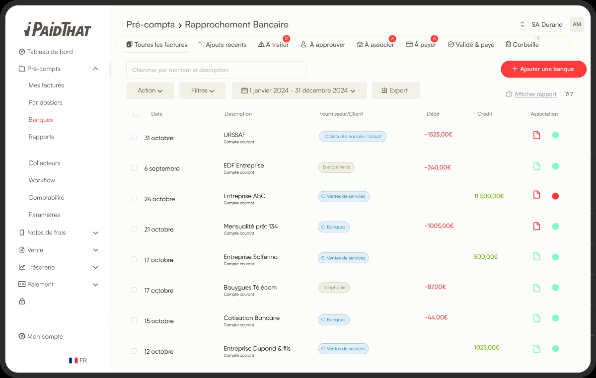 - Rapprochement bancaire : les comptes sont synchronisés en continu et chaque transaction est analysée pour être associée à la facture correspondante. Le système met en évidence les pièces manquantes ainsi que les dettes ou créances.