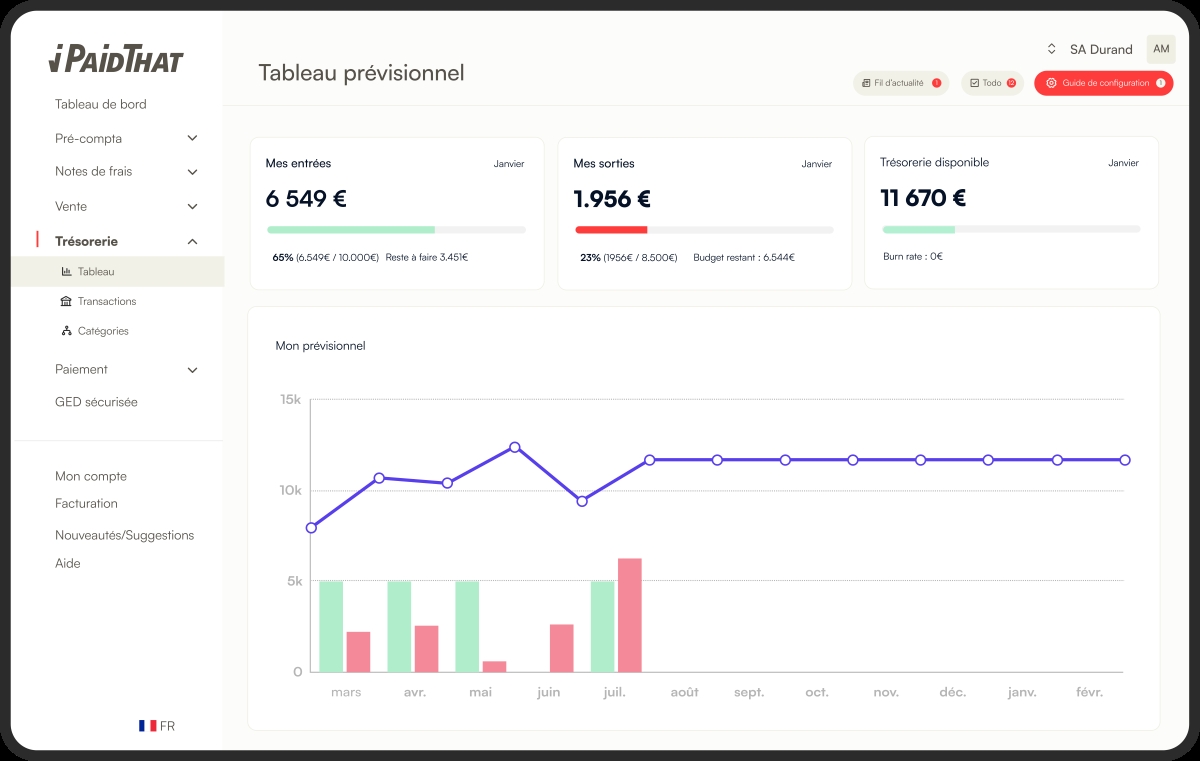 - Suivi de trésorerie : les entrées et sorties sont automatiquement catégorisées, les budgets se construisent à partir de l’historique et les prévisions se mettent à jour en temps réel.