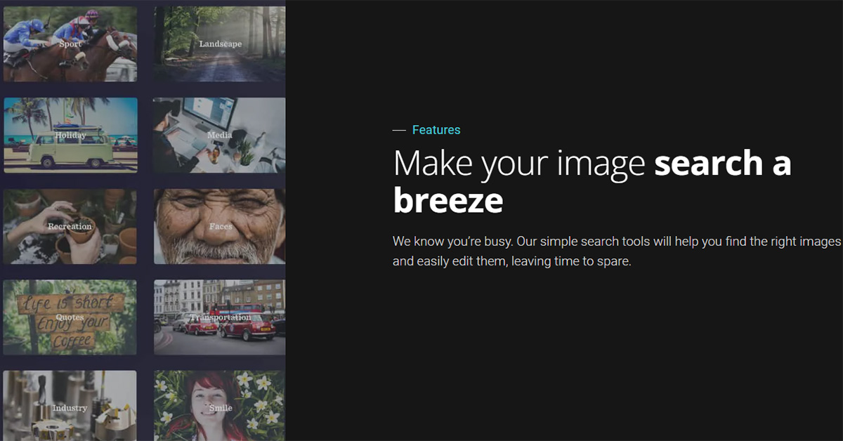 - Un moteur de recherche intelligent : l’IA TextMatch sélectionne des contenus visuels en fonction de mots-clés ou du contenu associé. Il propose aussi une recherche par couleur.