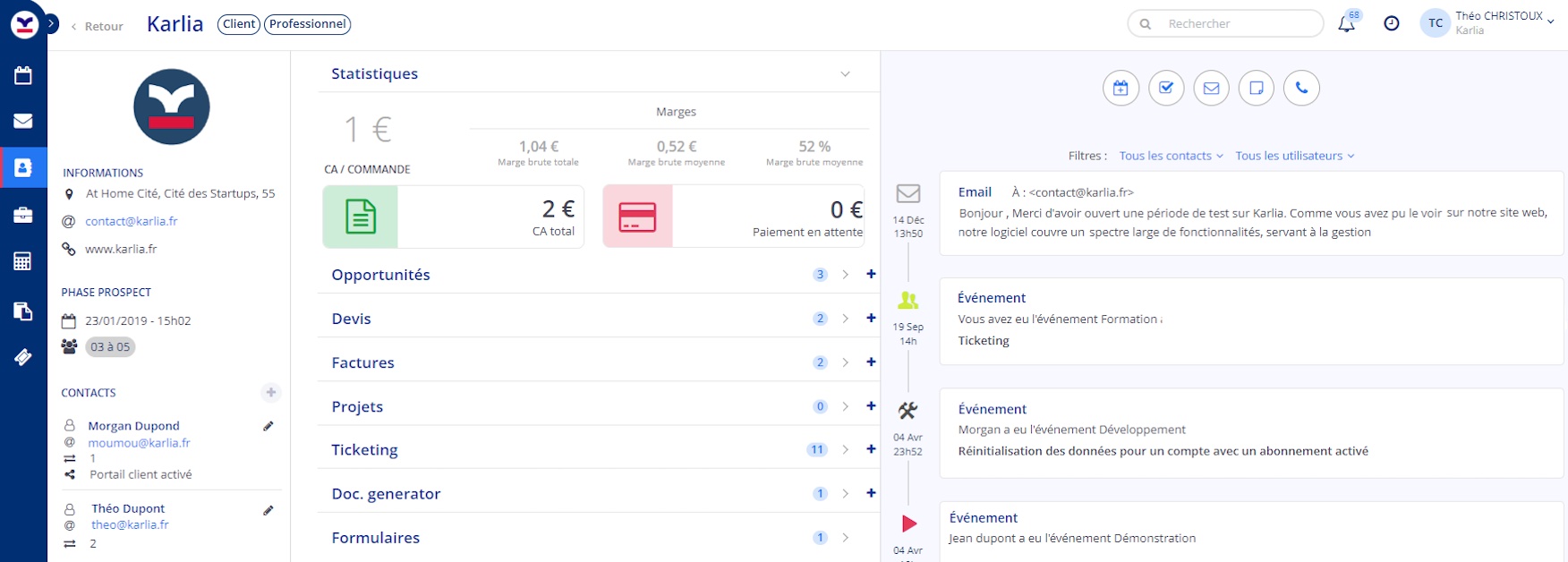Karlia est un logiciel CRM 100 % français conçu pour optimiser la gestion des ventes, de la facturation, des projets, et le support client. Il propose de nombreuses fonctionnalités s’intégrant facilement à vos outils du quotidien en entreprise, pour faciliter la gestion de la clientèle. Mais il offre aussi des solutions de prospection et de ventes et des fonctions de facturation. Des outils et modules complémentaires sont également proposés comme un générateur de documents, des automatisations, ou encore un portail client. Karlia se destine à toutes les entreprises e-commerce ou faisant face à des afflux de demandes clients à traiter.