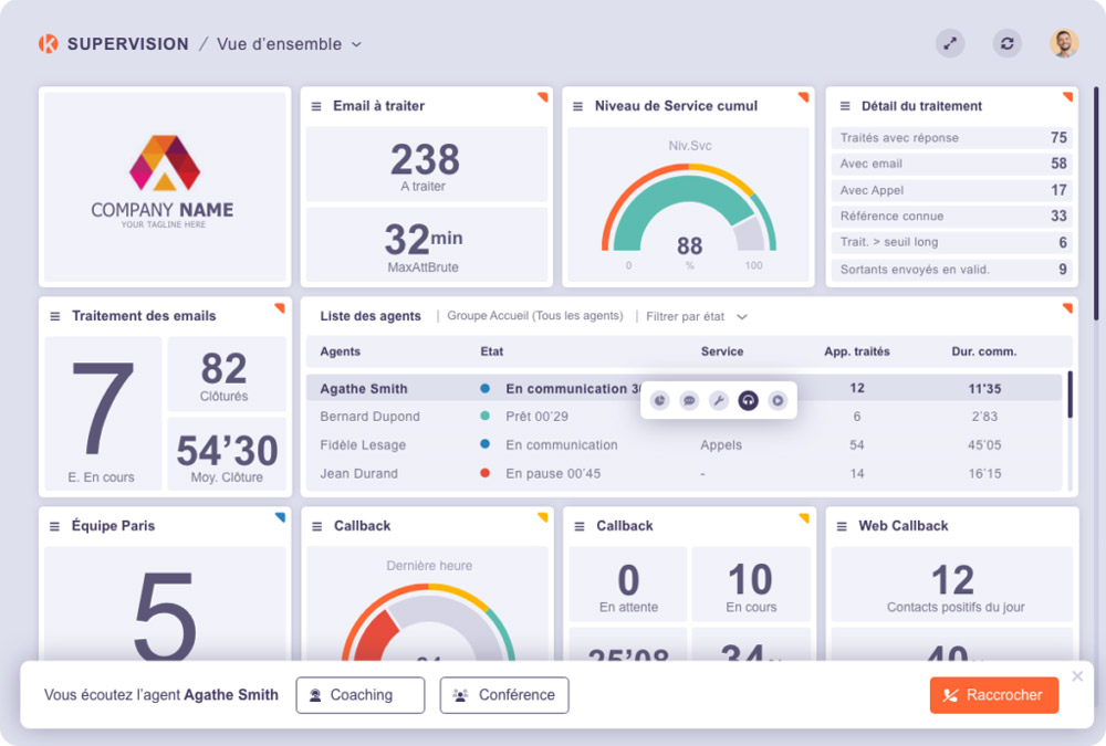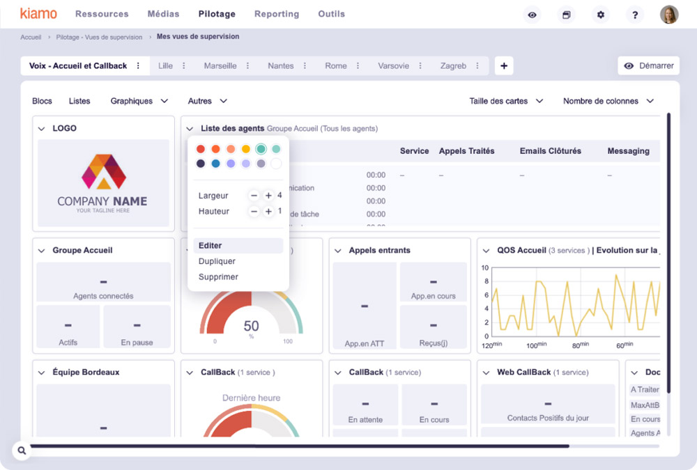 - Personnalisation de l’outil : Kiamo offre la possibilité de créer une expérience utilisateur sur mesure pour chaque conseiller. Il est possible d’intégrer une sélection d’indicateurs, de choisir un thème, une couleur, et une police d’écriture ou encore de paramétrer le volume et mémoriser des préférences.