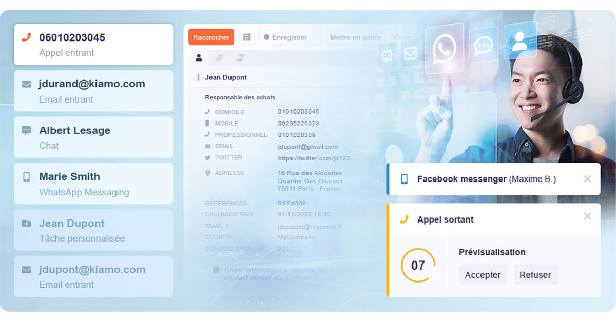 Kiamo est une solution conçue pour gérer les interactions avec les clients dans des centres de contact ou des centres d’appel. Cette solution s’adresse aux entreprises disposant d’un service client. Elle comprend différentes fonctionnalités :