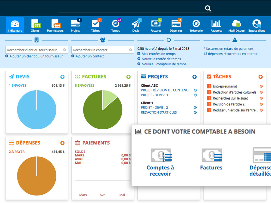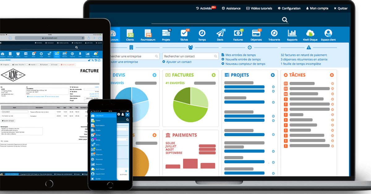 Kiwili est un logiciel ERP qui permet aux indépendants et petites entreprises de gérer l’ensemble de leurs activités : comptabilité, facturation, gestion des stocks, gestion de projet, suivi du temps, ressources humaines…