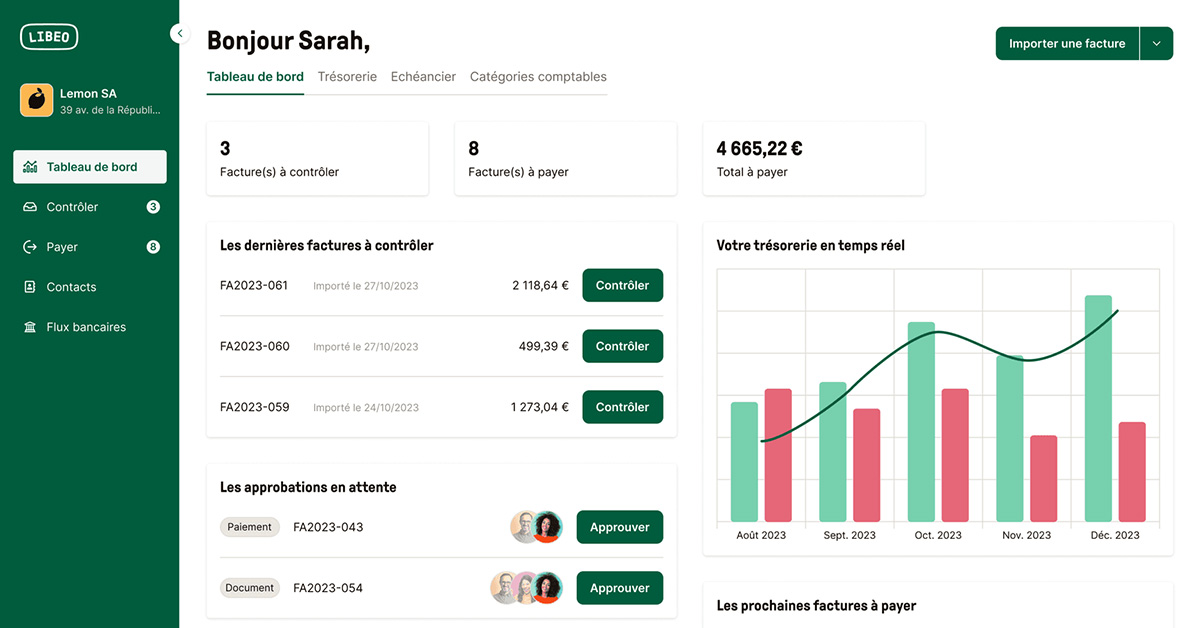 Libeo est un outil qui permet de centraliser, valider et payer les factures fournisseurs, mais aussi de piloter la trésorerie depuis une interface unique.