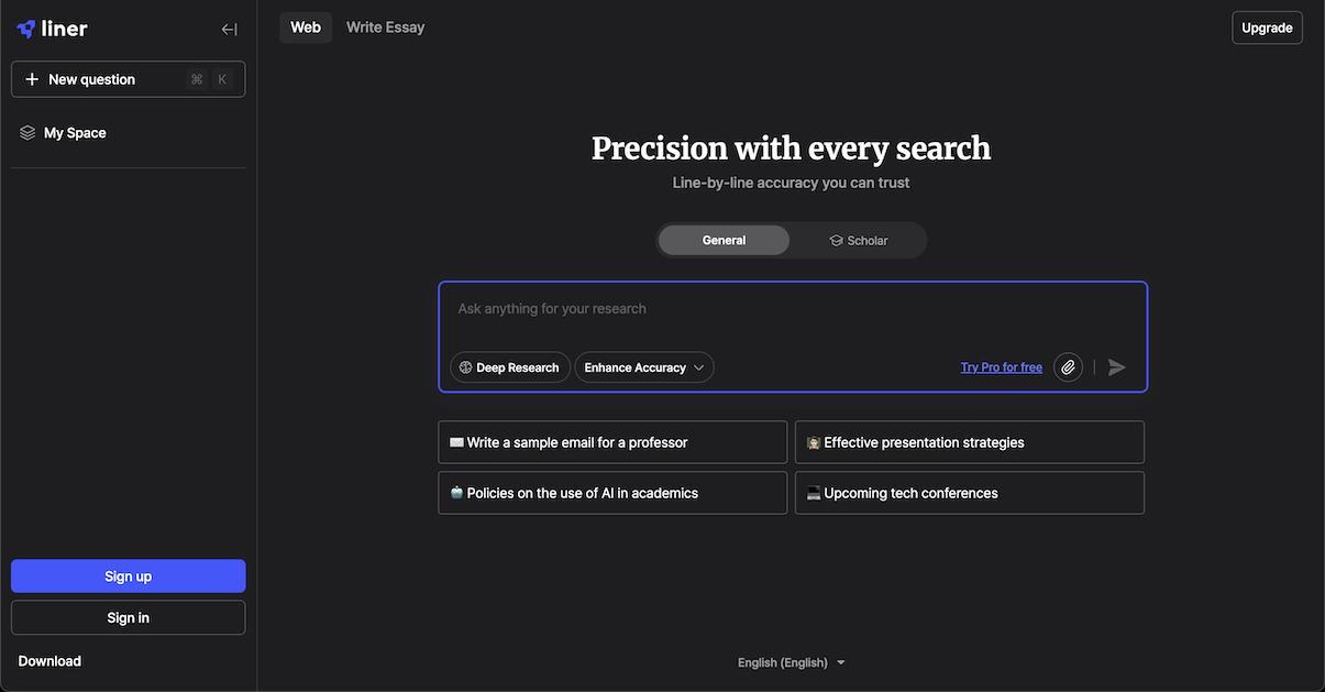 - Recherche assistée par IA : Liner reformule les requêtes et génère des réponses fiables à partir de sources reconnues,