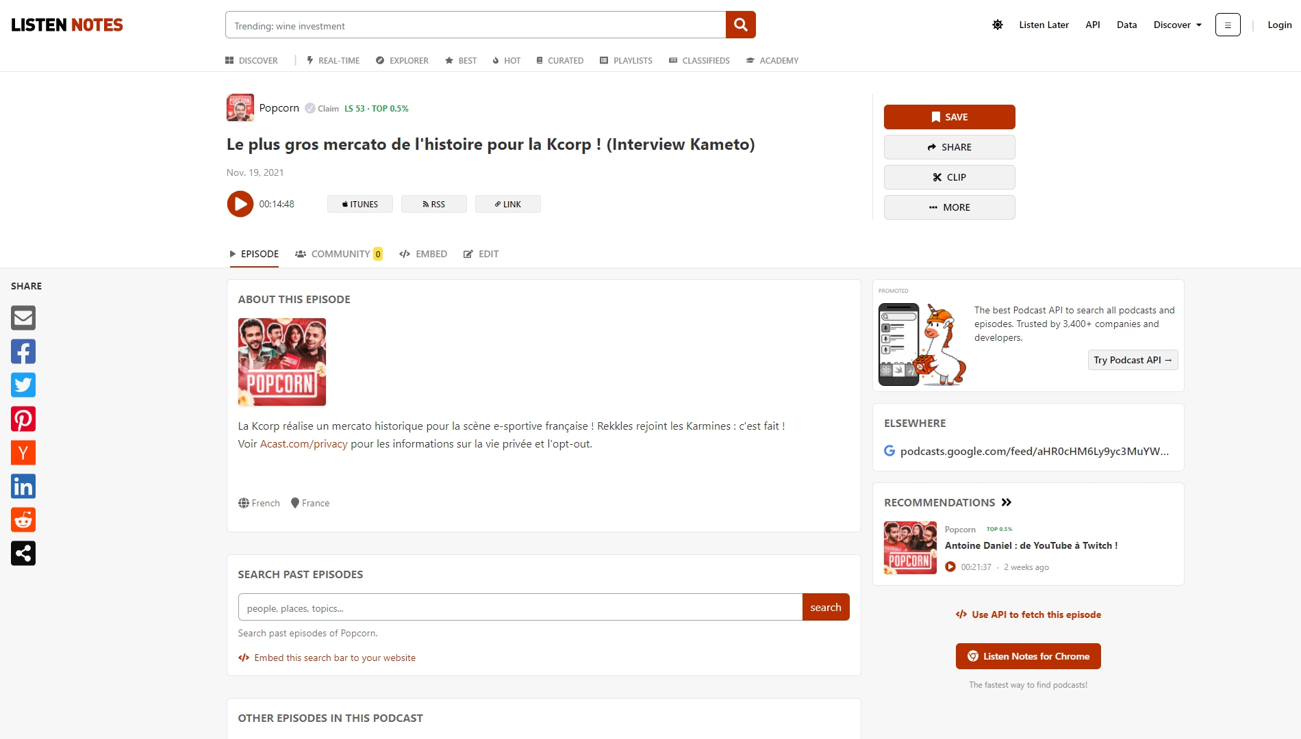 - clips : comme sur Twitch ou sur YouTube, Listen Notes offre une fonctionnalité qui permet de créer des clips pour isoler facilement les moments que vous souhaitez dans les podcasts. Une fois le clip créé, vous pouvez le partager sur les réseaux sociaux, le télécharger ou encore partager son lien.