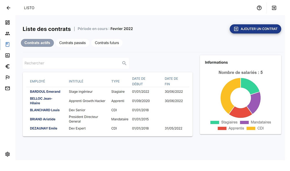 - Gestion des employés : la plateforme prévoit la centralisation des informations, comme les heures supplémentaires, les absences, les primes et les tickets-restaurant, de simuler et planifier la masse salariale, ou de gérer les affiliations mutuelle.