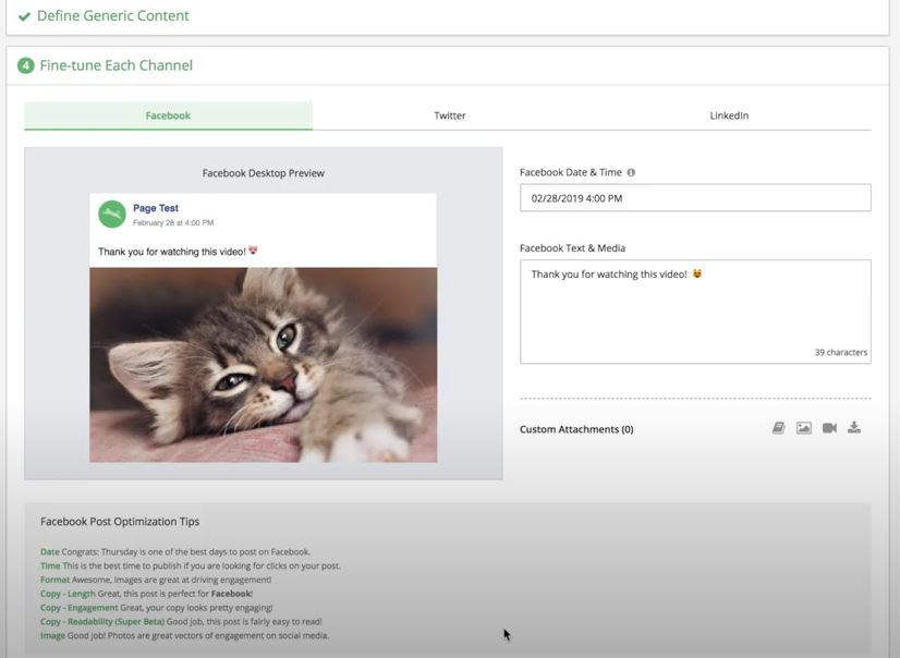 La plateforme permet de programmer et publier facilement des posts organiques et des publications sponsorisées. Elle vous propose des recommandations pour optimiser vos posts en fonction du réseau social choisi. Vous disposez d’un aperçu du rendu final de votre post lorsque vous êtes en train de le créer. Un calendrier visuel permet d’avoir une vue globale des publications à venir.