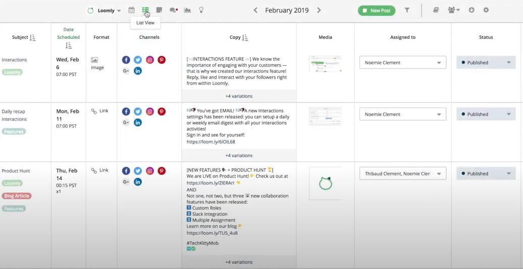 Loomly est un outil pour gérer les comptes des réseaux sociaux suivants : Facebook, Instagram, Twitter, Google My Business, Pinterest et LinkedIn.