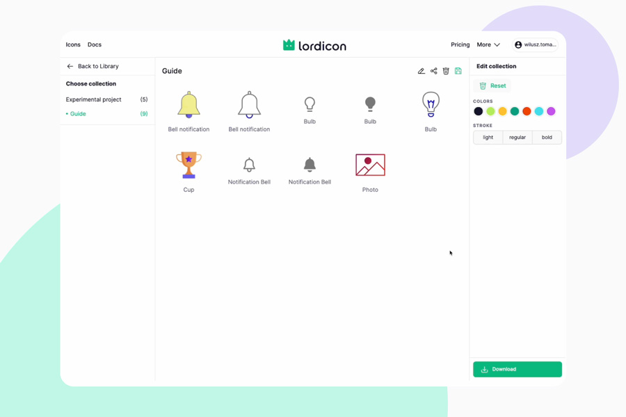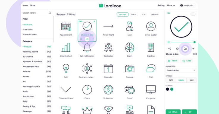 Lordicon est une bibliothèque d’icônes animées à utiliser sur des produits numériques, des présentations ou des vidéos. La plateforme est accessible depuis un navigateur web. La bibliothèque Lordicon propose plusieurs fonctionnalités :