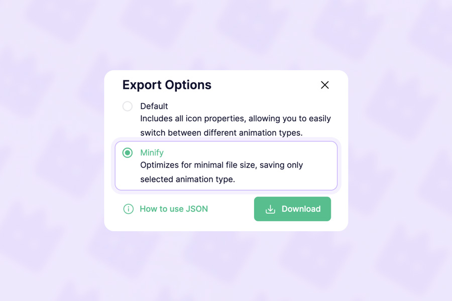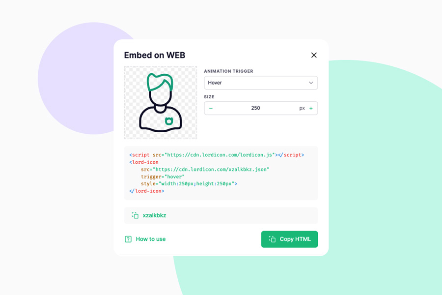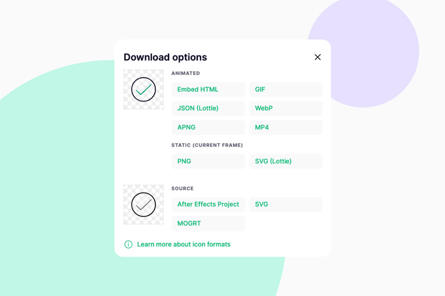 - Téléchargement : les icônes sont téléchargeables en plusieurs formats, animés ou statiques (HTML, JSON, GIF, WEBP, APNG, MP4, AEP, MOGRT, SVG et PNG). Elles peuvent aussi être intégrées à un site web au moyen du code HTML.