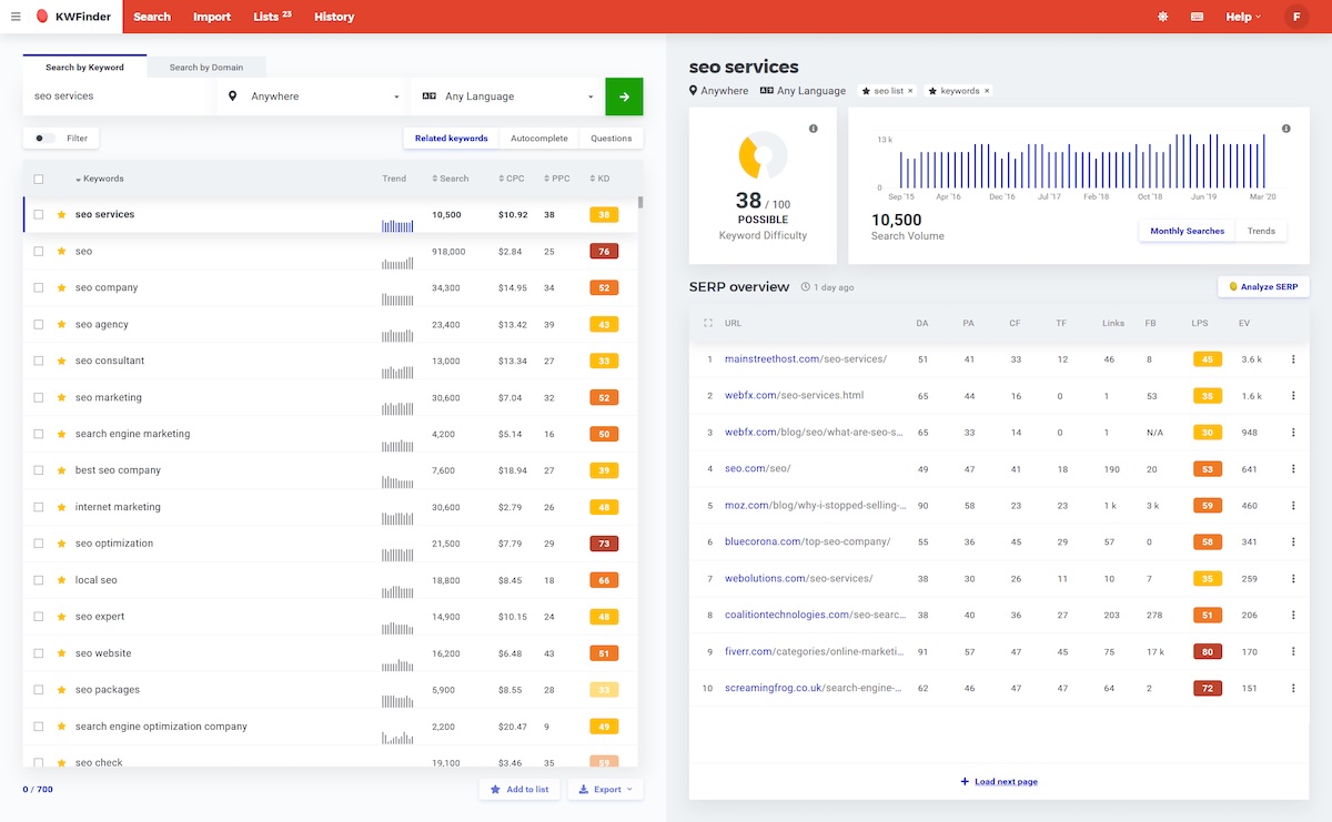 - Recherche de mots clés : KWFinder permet d’identifier les mots clés sur lesquels vos concurrents sont positionnés, en saisissant simplement un nom de domaine ou une URL. Il offre également la possibilité de repérer des requêtes longues traînes ciblées géographiquement.