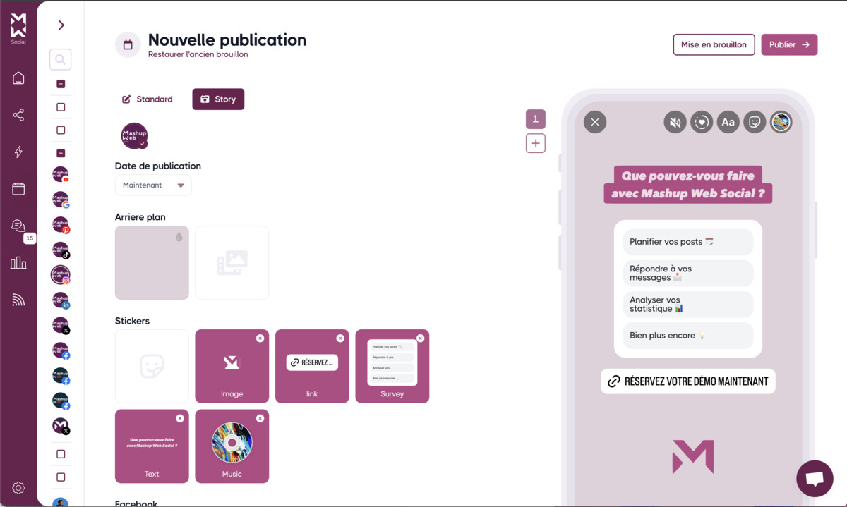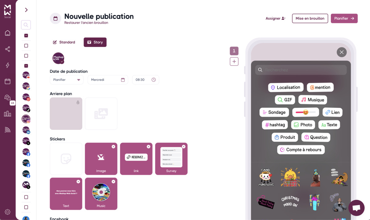 Mashup vous permet aussi de créer, planifier, publier des posts (y compris stories, Reels, carrousels mixte image/vidéo à partir de PDF, sondages etc.) selon les spécificités de chaque réseau.