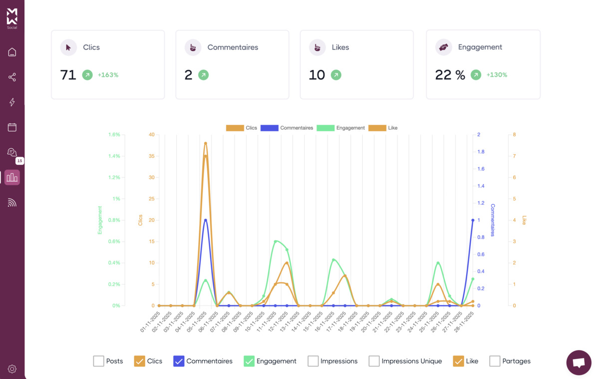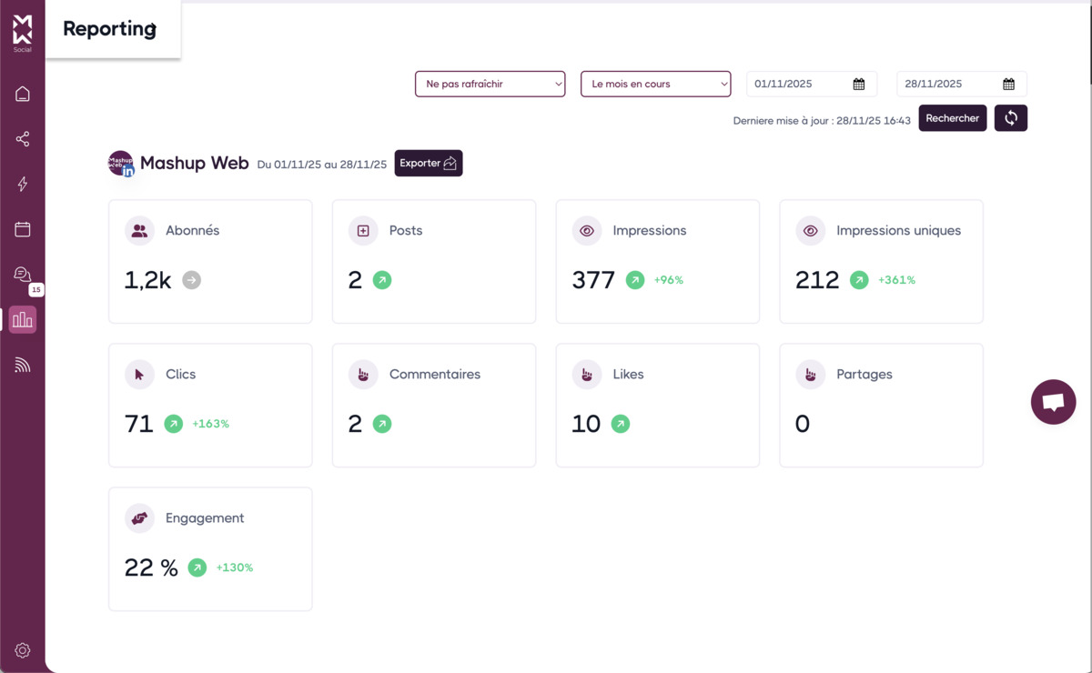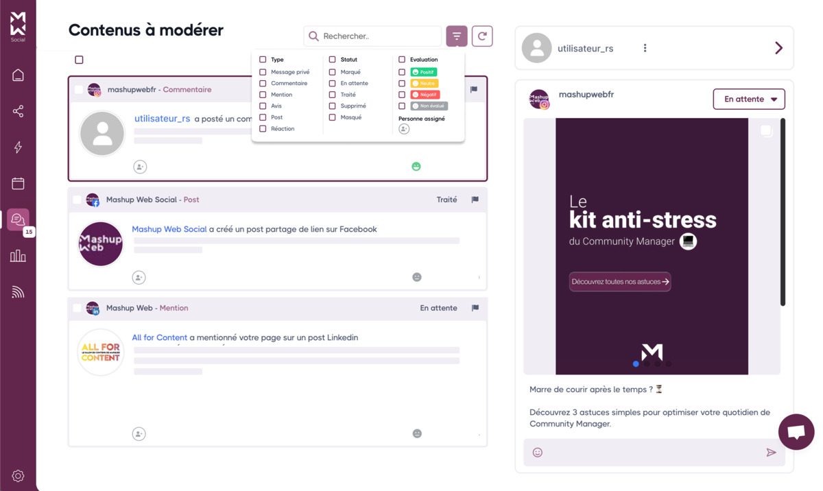 Mashup Web Social est une plateforme française de gestion des réseaux sociaux qui dispose d’une suite d’outils pour vous aider à gérer plus facilement vos pages Facebook, Instagram, LinkedIn, TikTok, X, Pinterest, Bluesky, YouTube, Threads ou encore les fiches Google Business Profile (GBP).