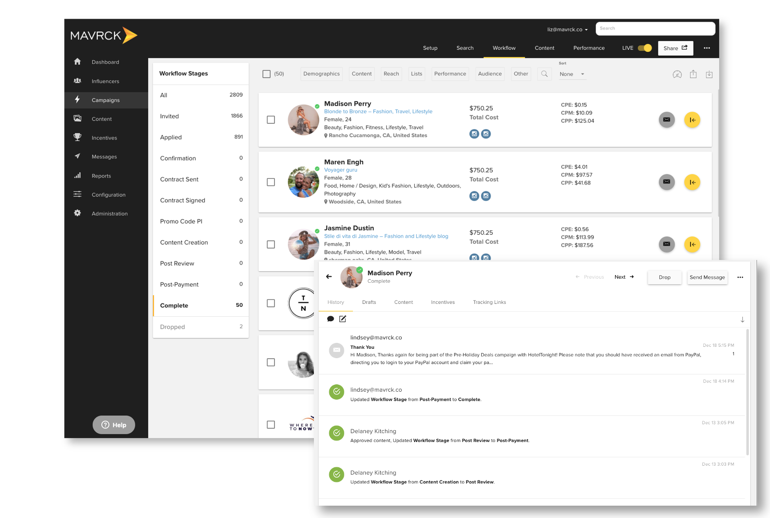 Mavrck est destiné aux marques et aux équipes qui souhaitent gagner du temps en automatisant la découverte d’influenceurs adaptés, et en obtenant des rapports complets et détaillés sur les performances de leurs campagnes, en visualisant les analyses influenceur par influenceur.