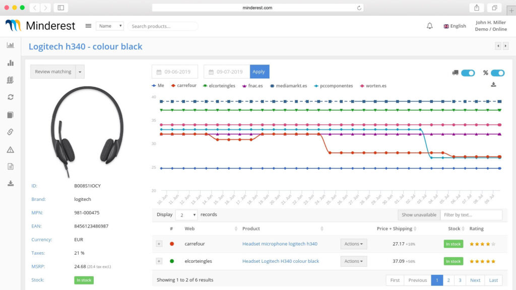 - l’analyse des prix des concurrents : l’outil permet l’analyse intelligente des prix et des activités de la concurrence. Ces informations sont accessibles via le tableau de bord de la solution qui donne un aperçu de l’historique des produits ou encore des tendances du marché.