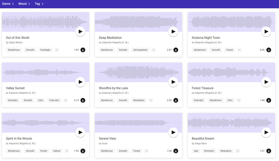- Les musiques : les pistes audio peuvent être utilisées comme musiques de fond pour des vidéos. Il est possible de filtrer les contenus par genre, par humeur et par étiquette.