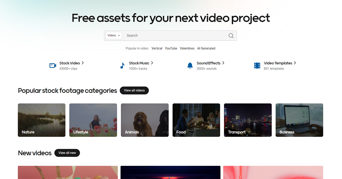 - Les vidéos : elles sont classées par catégories (nature, modes de vie, animaux, abstrait…). Le classement permet aussi de trouver rapidement des vidéos d’arrière-plan, des vidéos au format vertical et celles générées par une IA.