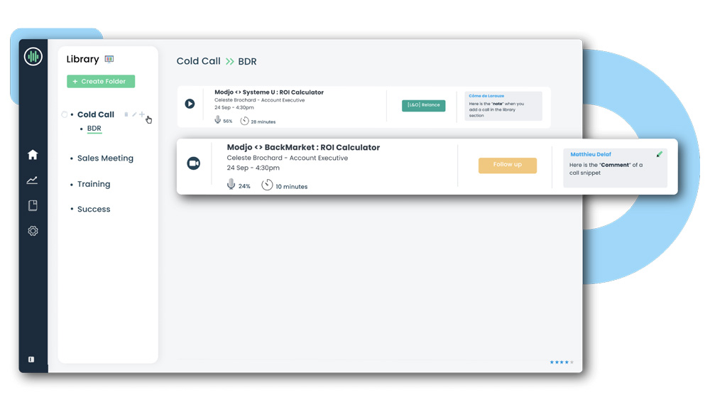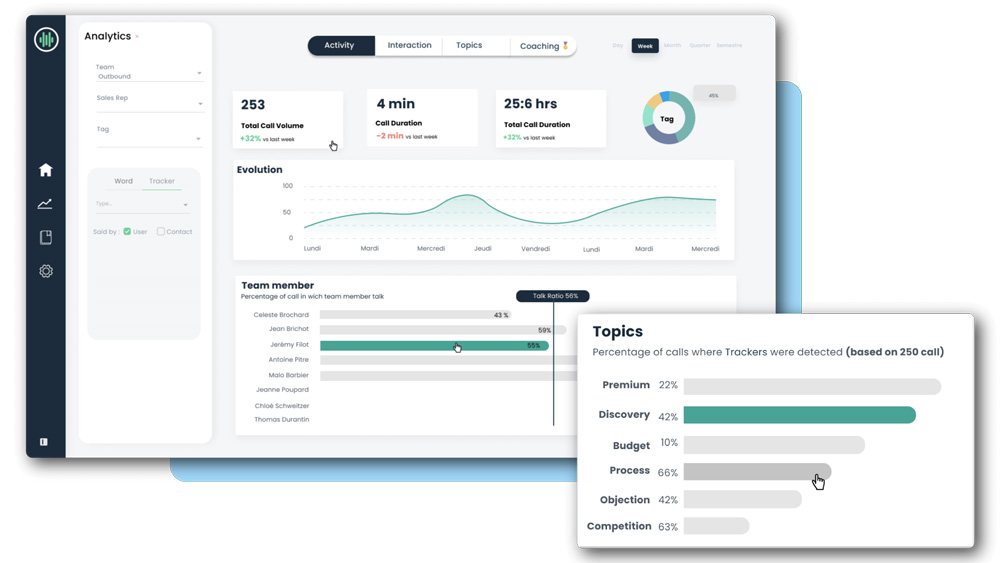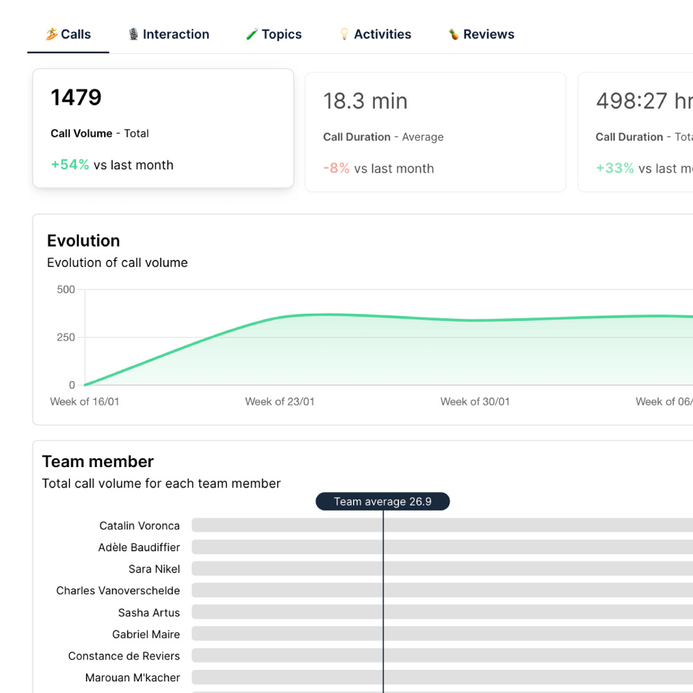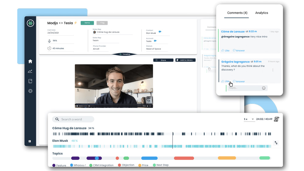 - Analyses et rapports : Modjo donne accès à l’ensemble des interactions client et données récoltées pour remonter les informations plus facilement et mettre en place les stratégies commerciales adaptées.