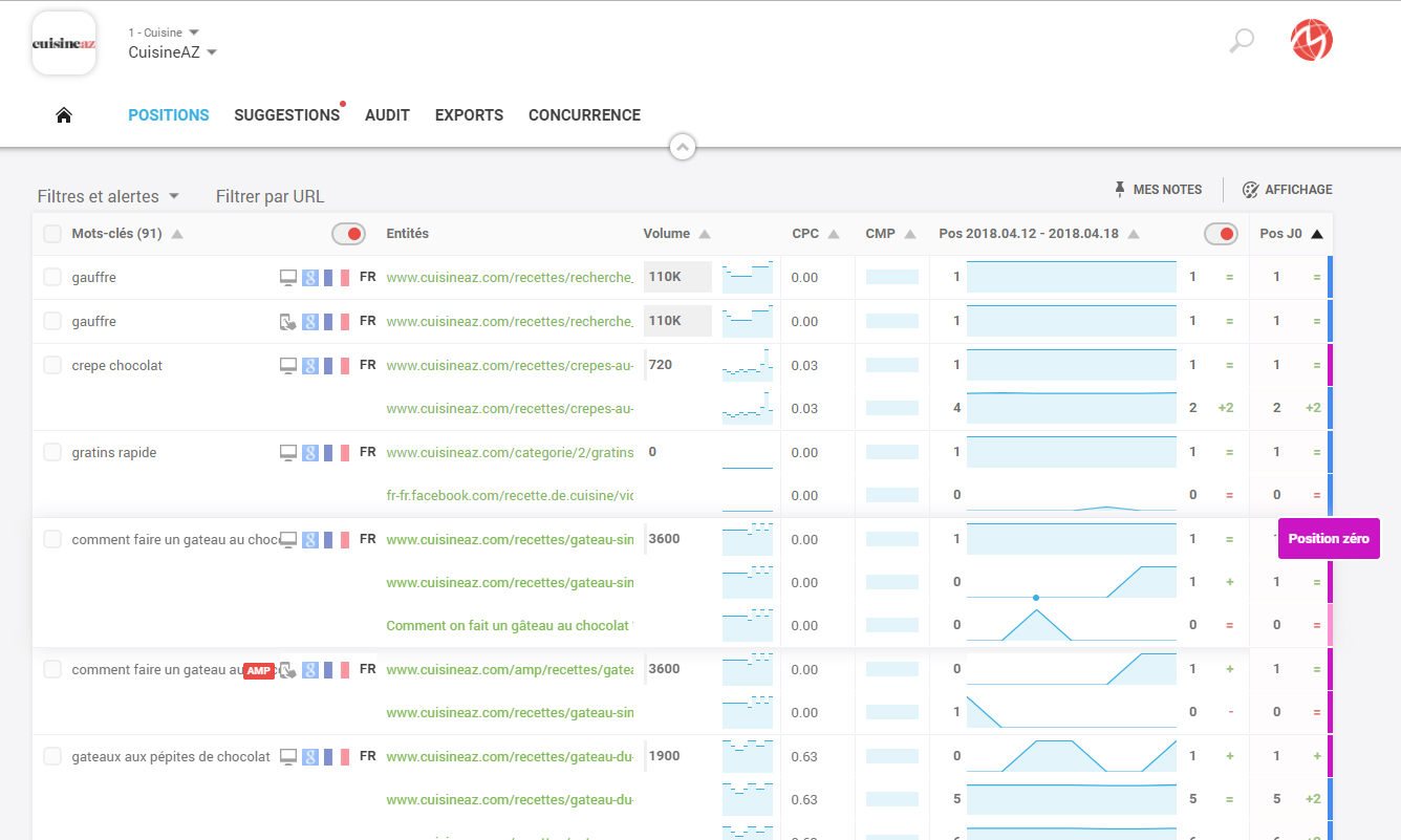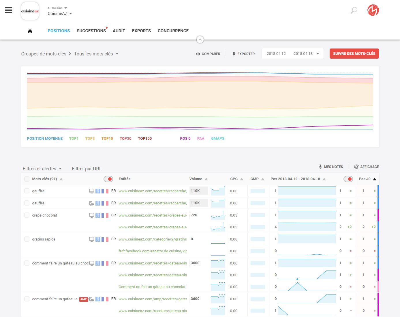 L’outil de positionnement permet le suivi d’un nombre plus ou moins élargi de mots clés (qui dépendra de la formule d’abonnement choisie) afin d’avoir en permanence un regard sur son propre référencement et sur celui de ses concurrents. Monitorank permet notamment de faire des recherches géolocalisées dans l’objectif de cibler un marché ou une audience spécifique (vérifier l’évolution de la position d’un salon de coiffure à Nantes par exemple). Après avoir consulté votre positionnement sur les moteurs de recherche ciblés, Monitorank peut aussi vous aider à trouver de nouvelles idées de mots-clés afin d’optimiser votre visibilité en jouant par exemple sur la longue traîne (un grand nombre de mots pas forcément concurrentiels mais qui ramèneront chacun du trafic qualifié).