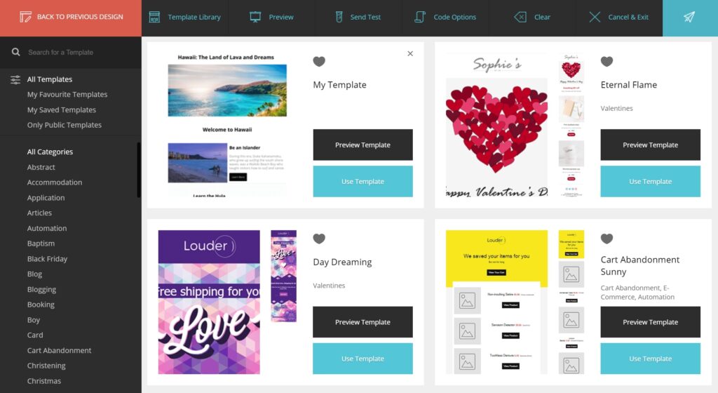 - Création d’emails et pages d’atterrissage : il est possible de créer des emails à partir de zéro, grâce à un éditeur simple d’utilisation et sans recours au code HTML. Vous pouvez aussi utiliser un des nombreux modèles existants.