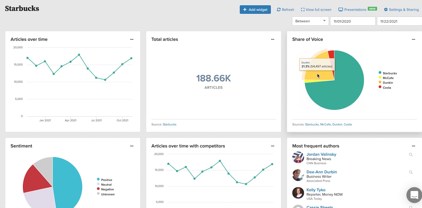 - Rapport sur les campagnes : Muck Rack permet de démontrer l’impact et le succès de vos relations presse. Le logiciel conçoit des tableaux de bord personnalisés selon les métriques qui comptent le plus pour vous.