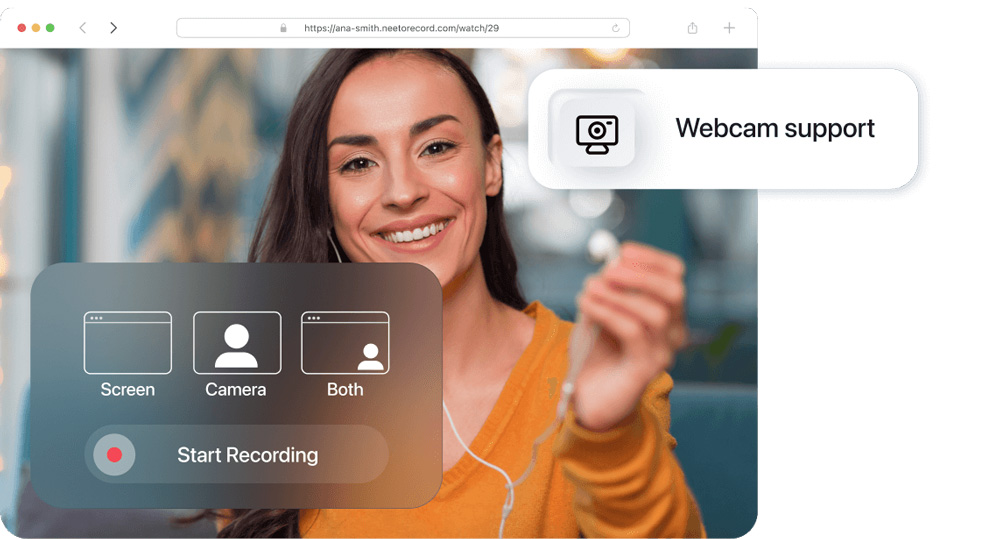 - De réaliser un enregistrement avec votre webcam pour une présentation, une démo ou l’ajout d’une touche personnelle à votre contenu.