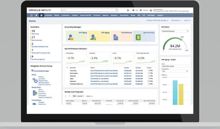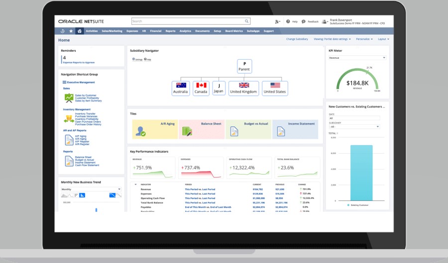 - Comptabilité : NetSuite Cloud Accounting Software vous donne accès aux données financières en temps réel. Vous pouvez observer les multiples mesures financières telles que la rentabilité, les marges d’inventaire ou encore les impôts. Certaines tâches chronophages telles que la rédaction d’un journal comptable, peuvent être automatisées.