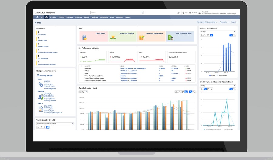 - Gestion de l’inventaire : un module NetSuite Inventory Management fournit une vue unique et en temps réel des stocks sur tous les sites et canaux de vente.