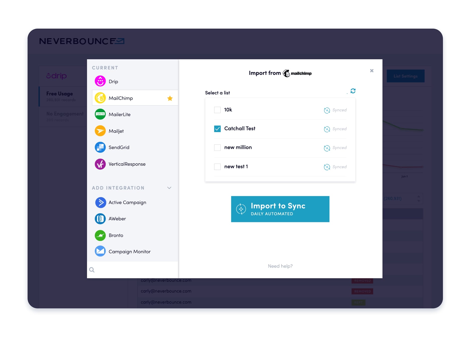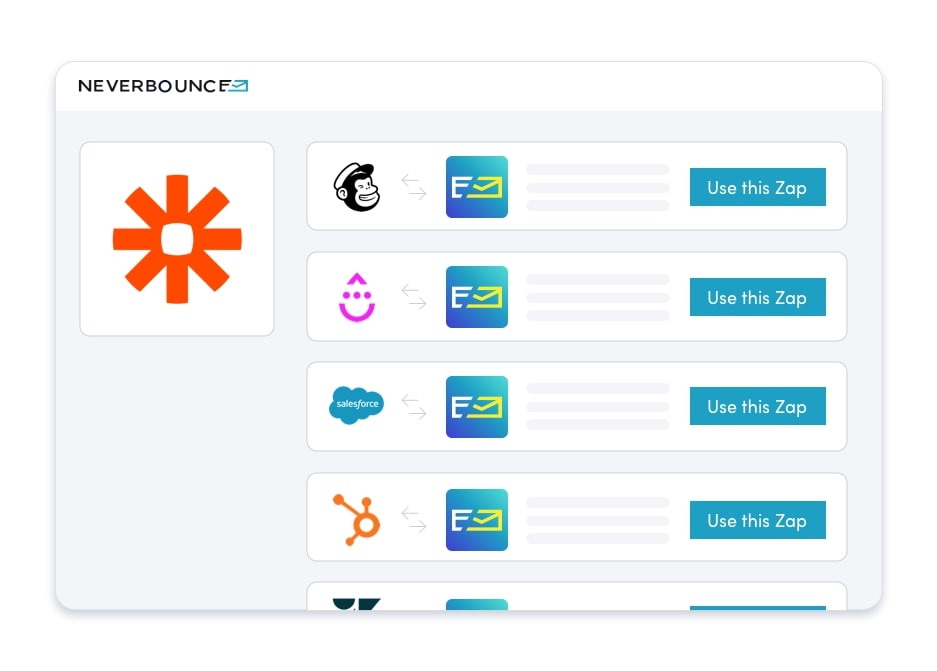Les nettoyages de listes peuvent être paramétrés pour être effectués quotidiennement sur vos CRM ou solution d’emailing, assurant des données mises à jour 24 heures sur 24. Neverbounce permet des intégrations avec plus de 80 plateformes dont HubSpot, Mailchimp, Marketo, Salesforce, Mailjet, Zapier ou encore Zendesk.