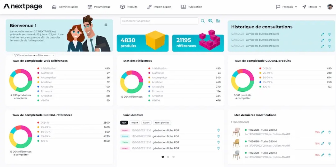 Synchronisée avec votre système d’information (ERP, PLM, CRM, CMS, etc.), NEXTPAGE centralise au sein d’une interface unique l’ensemble des fonctionnalités nécessaires pour structurer, enrichir et maintenir à jour la base de données produits.