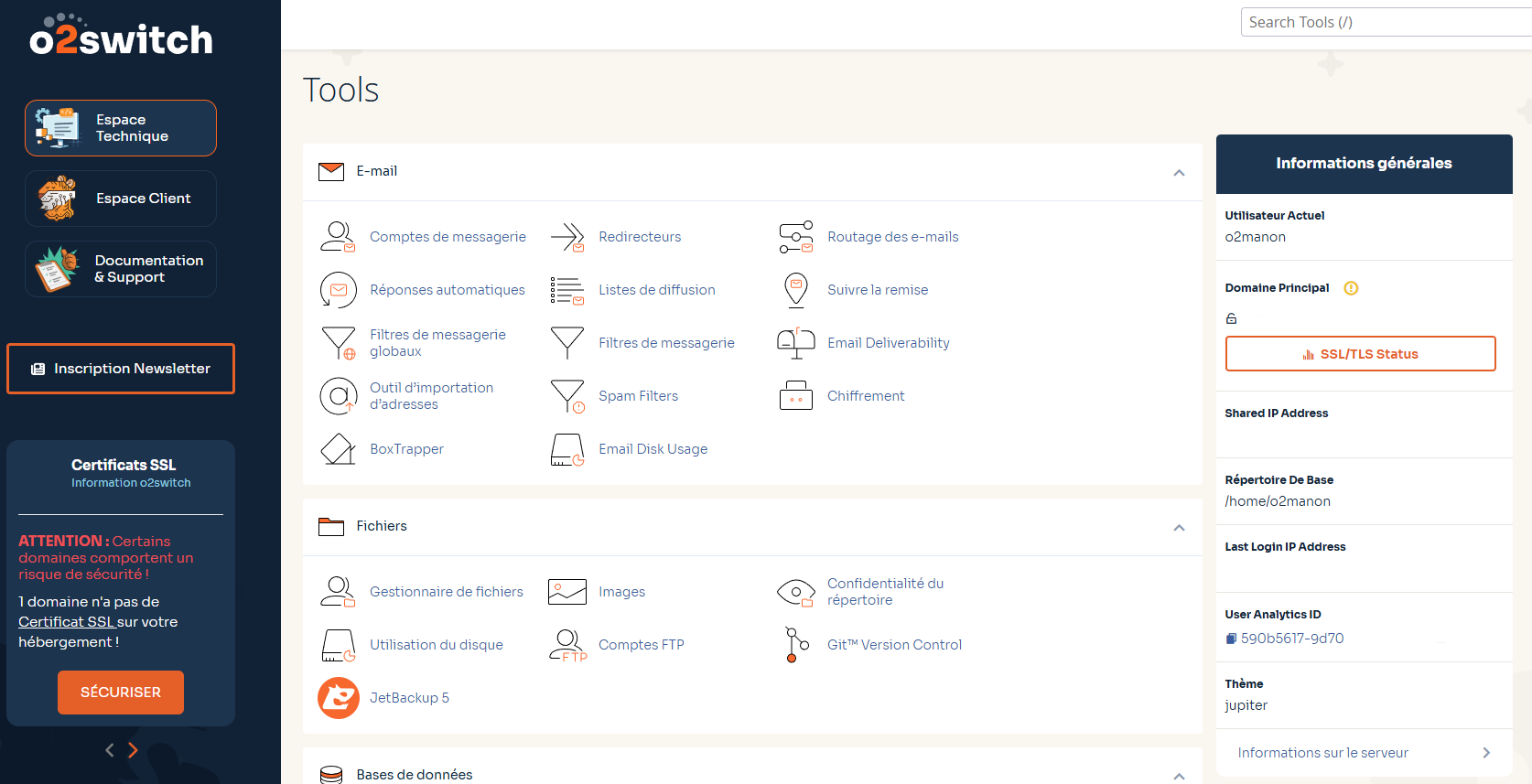 L’offre proposée par o2switch permet un hébergement mutualisé d’un ou plusieurs sites web à partir d’une seule interface d’administration, nommée cPanel, qui est organisée en plusieurs catégories. Les principales fonctionnalités proposées sont les suivantes :
